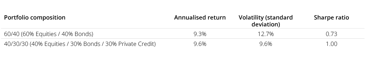 This table demonstrates how adding private credit can enhance risk-adjusted returns, reducing volatility by approximately 24% while slightly boosting overall returns – empowering IFAs to build more resilient portfolios.